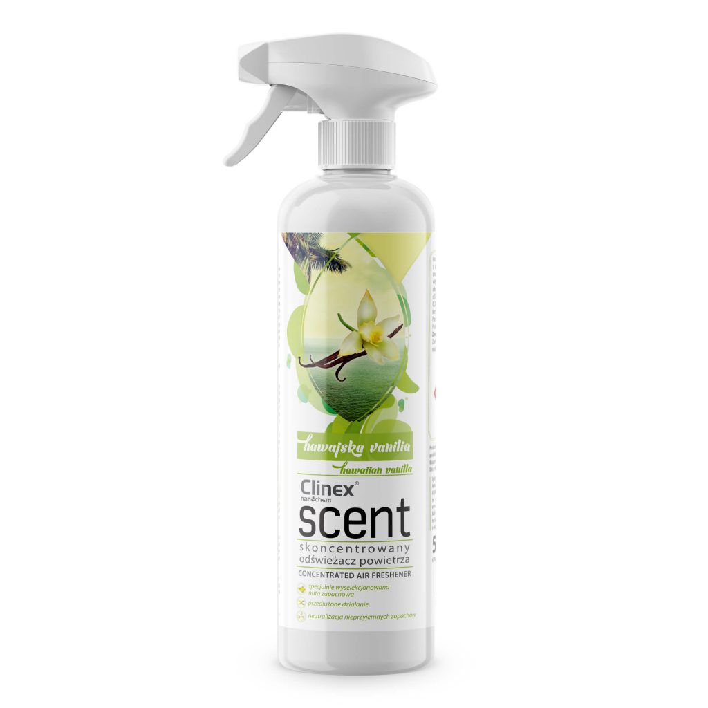 Clinex Scent Hawajska Wanilia to wysoce skoncentrowany odświeżacz powietrza, który jest unikalnym produktem do zastosowania we wszelkiego rodzaju pomieszczeniach, idealny do odświeżania powietrza w biurach, przestrzeniach dla palących, pokojach gościnnych, toaletach. Dedykowany zwłaszcza branży Ho Re Ca. Unikalna nuta zapachowa sprawia, że preparat wyróżnia się efektywnym działaniem na nieprzyjemne zapachy we wszystkich obszarach. Clinex Scent Hawajska Wanilia posiada także właściwości neutralizujące nieprzyjemne zapachy, co sprawia, że jest odpowiedni do stosowania w pomieszczeniach o charakterze publicznym, w których trudne jest utrzymanie bieżące czystości (np. toalety publiczne).